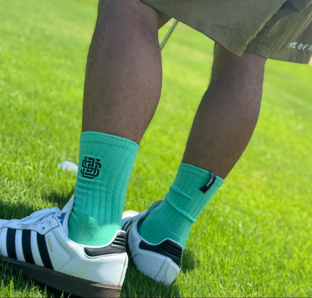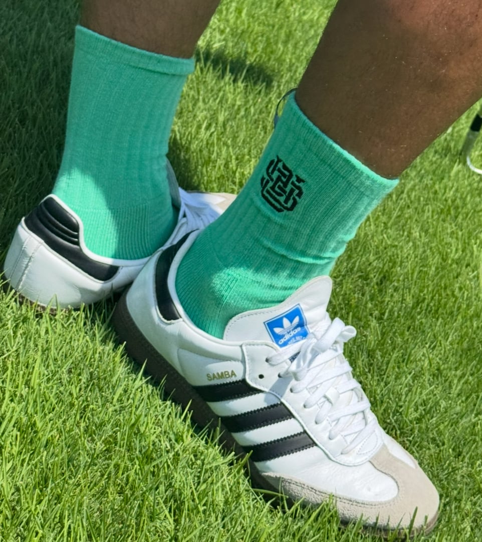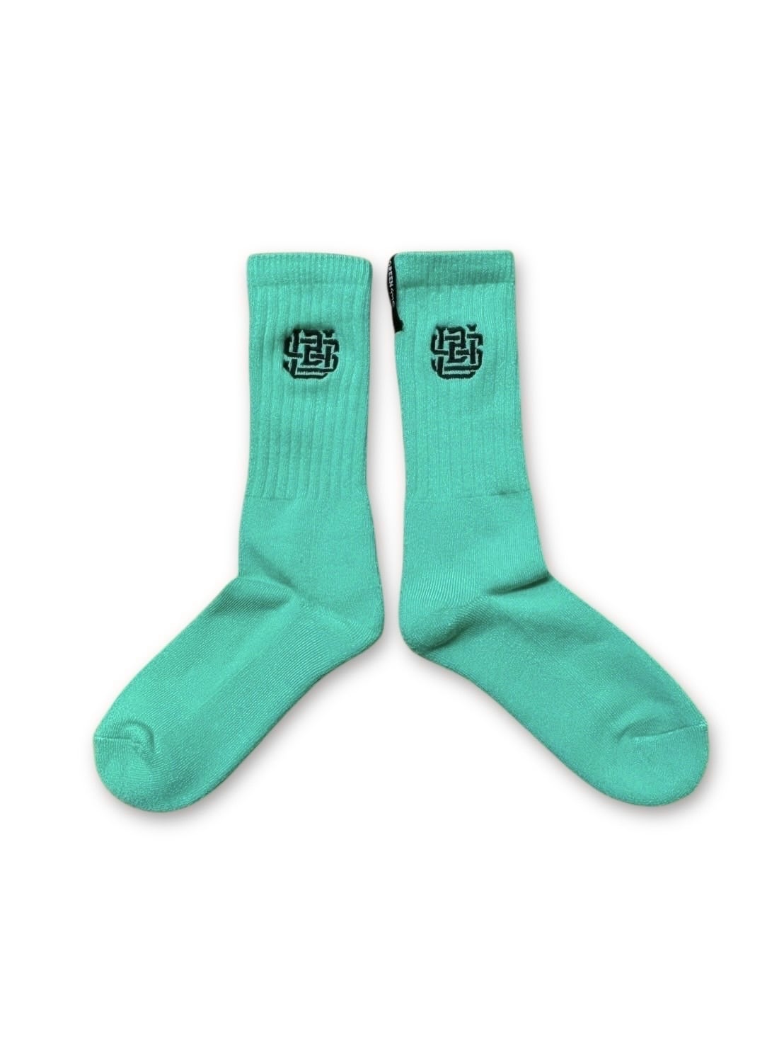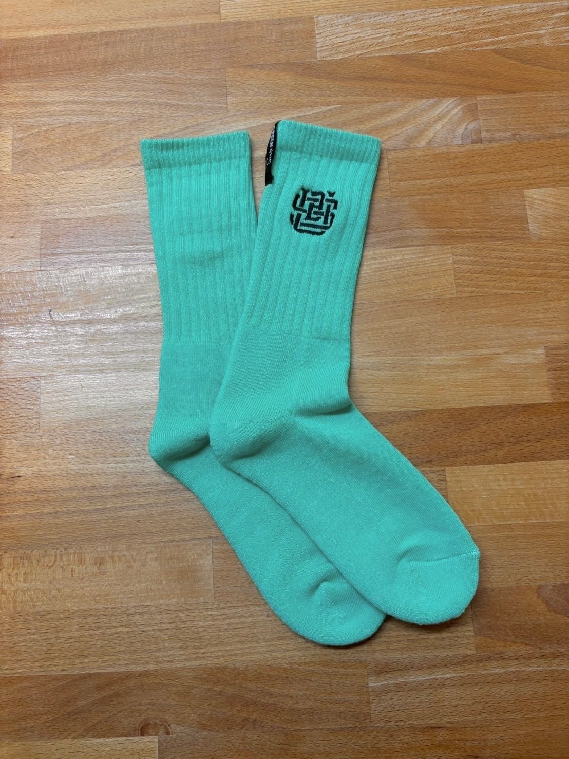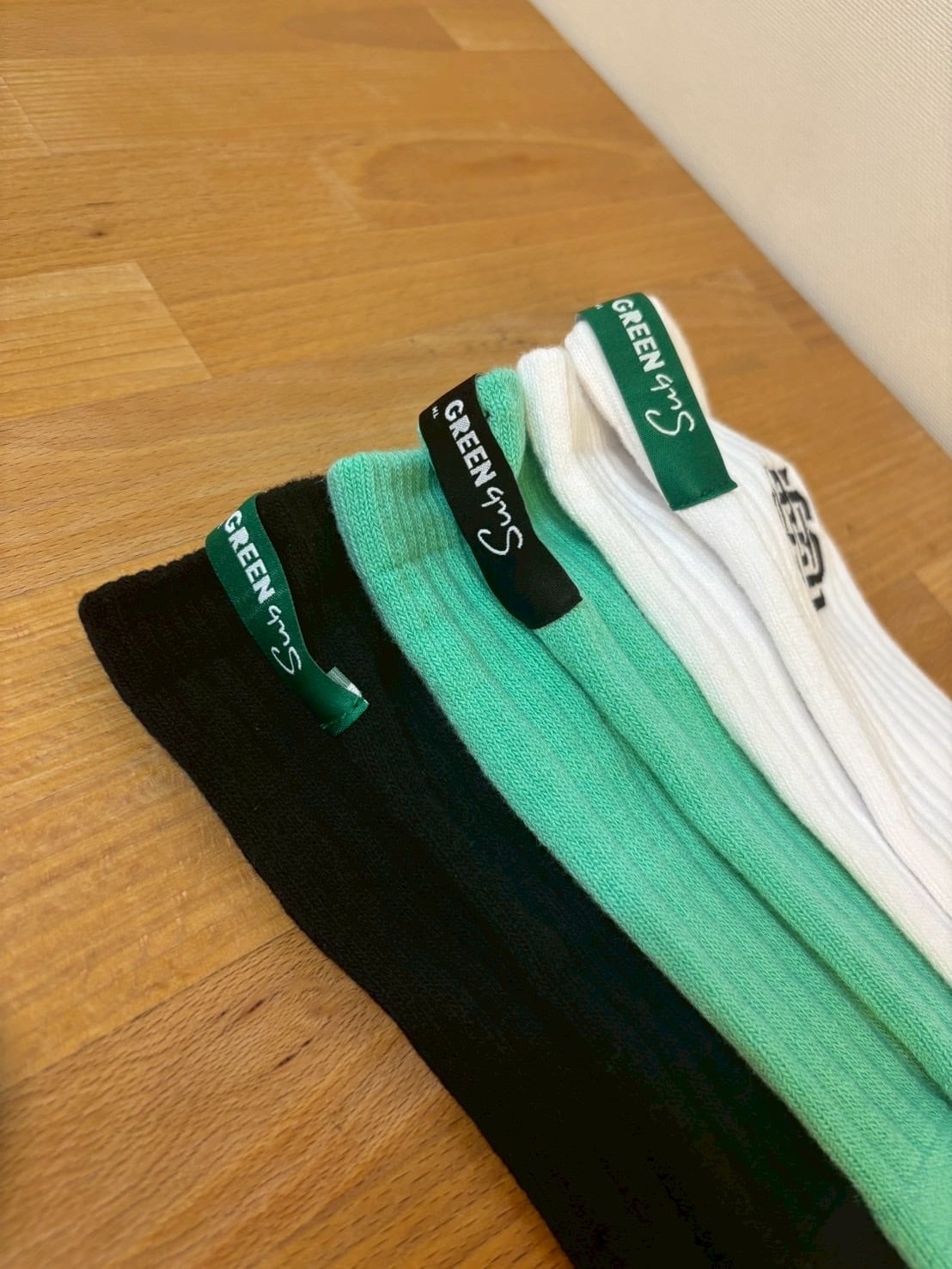右足のみ、SUB GREENのウーブンラベルでアクセントに。