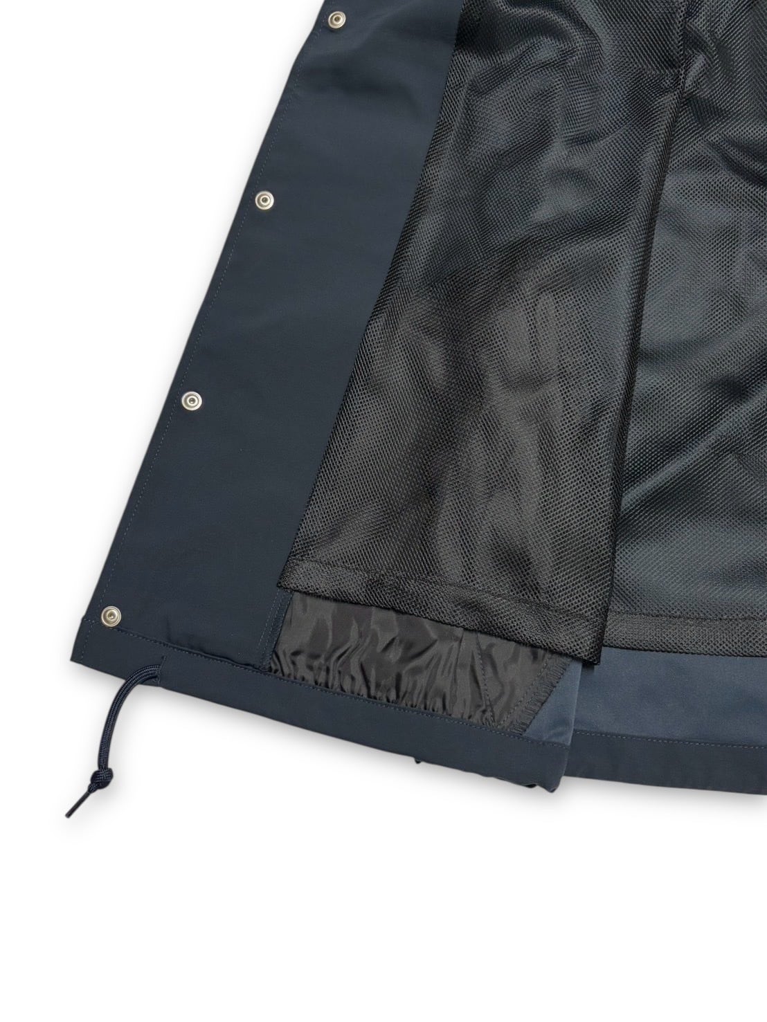 フロントのボディー同色のドットボタンや裾のドローコードなど、ディテールにもこだわりを。